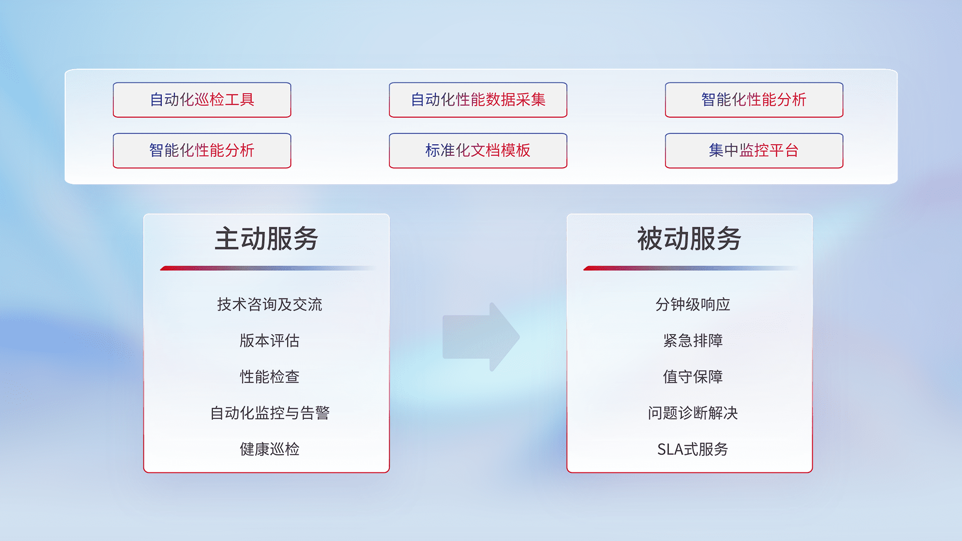 智能化工具和标准化文档,,,,保障服务质量,,,提供主动服务(包含技术咨询、、、、版本评估、、性能检查、、、自动化监控与告警、、、、健康巡检)和被动服务包含(分钟级响应、、、、紧急排障、、、、值守保障、、、问题诊断解决、、SLA服务)。。。