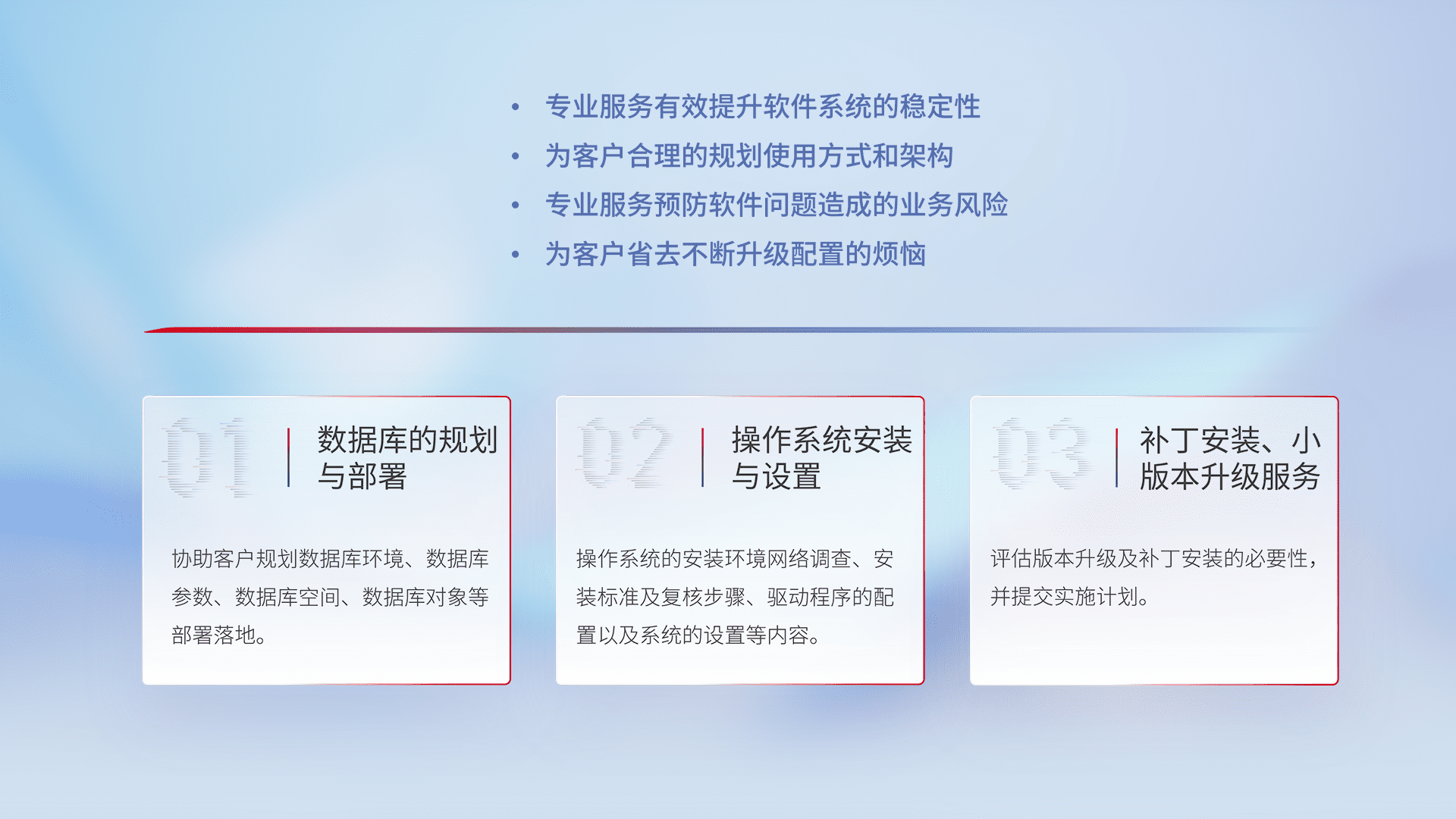 为客户提供软件规模升级、、快速部署、、、按需配置的专业服务,,,从数据库的规划与部署到操作系统的安装与设置,,再到补丁安装和小版本升级提供支持。。。。